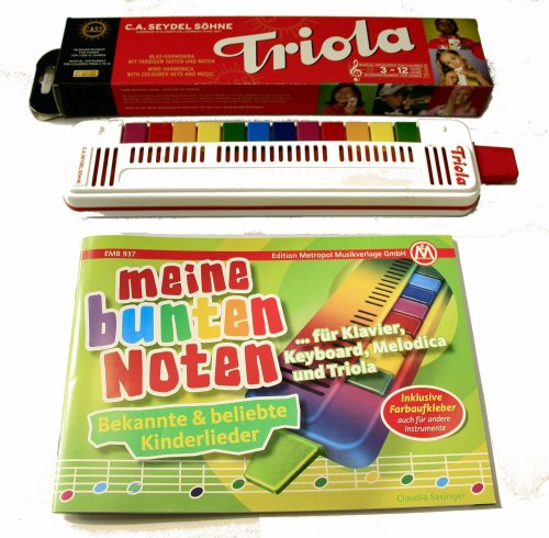 Inhalt Liederbuch: Kleine Einführung in die Notenschrift --- ALLE MEINE ENTCHEN --- ALLE VÖGEL SIND SCHON DA --- BACKE BACKE KUCHEN --- BRUDER JAKOB --- BRÜDERLEIN KOMM TANZ MIT MIR --- DER KUCKUCK UND DER ESEL --- DER MOND IST AUFGEGANGEN --- DORNRÖSCHEN WAR EIN SCHÖNES KIND --- DREI CHINESEN MIT DEM KONTRABASS --- EIN MÄNNLEIN STEHT IM WALDE --- ES REGNET --- ES TANZT EIN BI BA BUTZEMANN --- FUCHS DU HAST DIE GANS GESTOHLEN --- GROSSE UHREN --- GRÜN GRÜN GRÜN SIND ALLE MEINE KLEIDER --- GUTEN ABEND GUT NACHT --- HÄNSEL UND GRETEL --- HÄSCHEN IN DER GRUBE --- HOPP HOPP HOPP --- HOPPE HOPPE REITER --- KOMMT EIN VOGEL GEFLOGEN --- LATERNE LATERNE --- NÜSSE SCHUETTELN --- OLD MACDONALD --- RINGEL RINGEL REIHE --- RI RA RUTSCH --- SANKT MARTIN --- SCHLAF KINDLEIN SCHLAF --- SUMM SUMM SUMM --- WER WILL FLEISSIGE HANDWERKER SEHN --- Wo sind welche Töne? --- Farbaufkleber Im Set mit dem Triola-Liederbuch "Meine bunten Noten" - dieses Liederbuch enthält neben 30 beliebten Kinderliedern auch eine kurze Einführung in die Notenschrift. Diese Blasharmonika ist ein Instrument für Kinder zur einfachen Einführung in die musikalische Früherziehung. Das Instrument besitzt 12 Tasten, die beim Blasen und gleichzeitigem Drücken den entsprechenden Ton freigeben. Es ist sowohl Einzelton als auch Akkordspiel möglich.